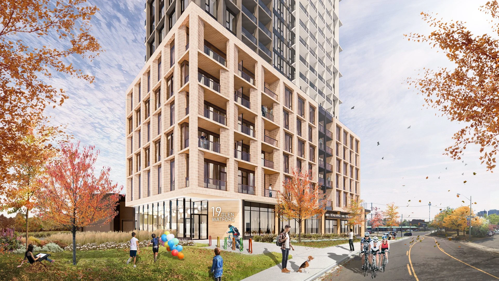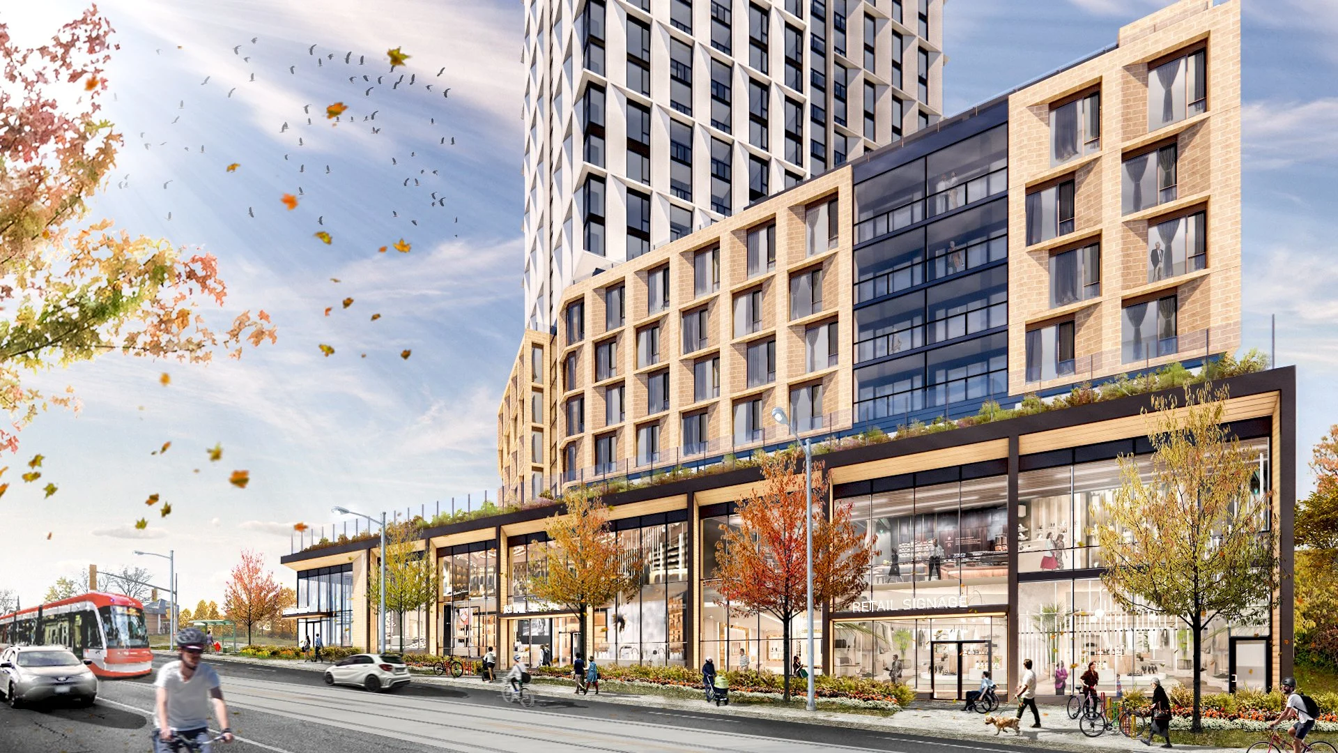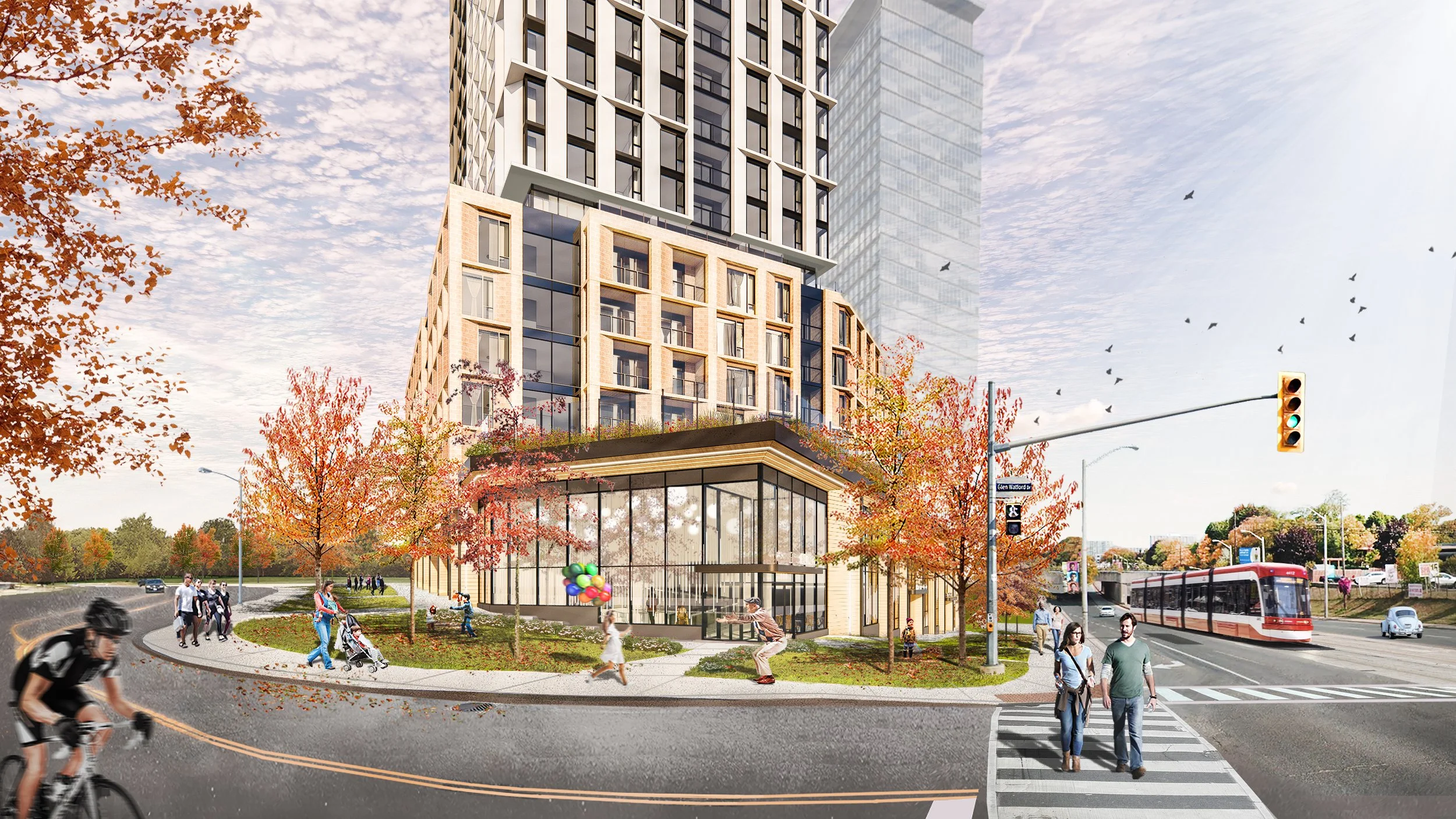 Proposed for a prominent Scarborough corner near transit, this 35-storey tower is a mixed-use development. Its clean tower form rises above a dynamic, undulating podium, creating a striking architectural presence. The design prioritizes a strong, open connection to the street, enhancing the pedestrian experience, with the aim to be a vibrant new transit-oriented destination for the community.